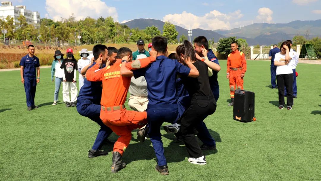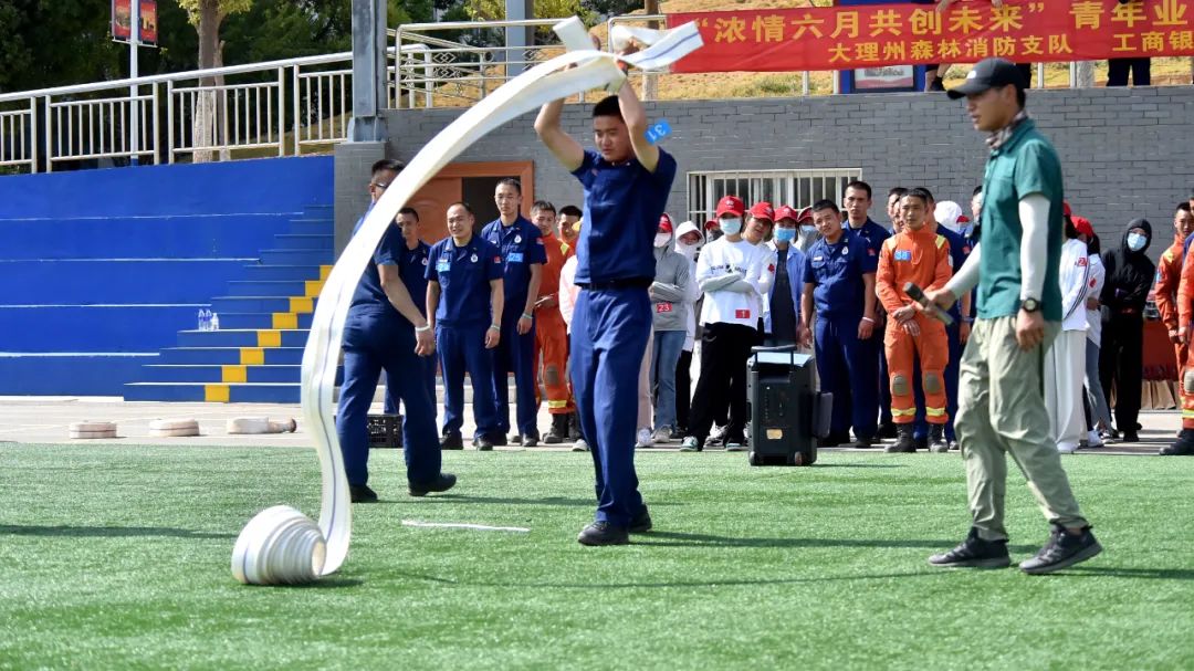 大理州森林消防支队青年消防救援人员代表展示消防救援实操技能,展现森林消防队伍的过硬本领和坚毅精神。
