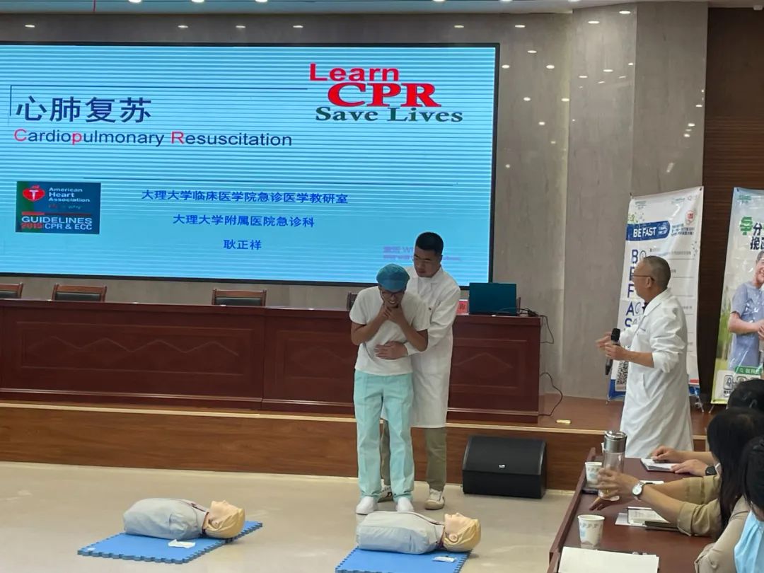 其次,大理大学第一附属医院内科一支部及急诊科人员进行心肺复苏演示。