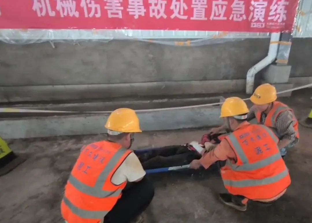 应急演练前,由项目经理进行演练前动员,并强调各参演人员要按照演练方案有序地开展演练工作。演练过程中,由安全负责人进行机械伤害知识和应急救援知识讲解,演练模拟了工人在使用切割机下料时造成机械伤害事故,项目部迅速启动应急救援预案,迅速组织相关救援力量实施救援,在最短时间内充分发挥安全保障机制作用,有效减少人员伤亡和维护施工作业人员生命安全。