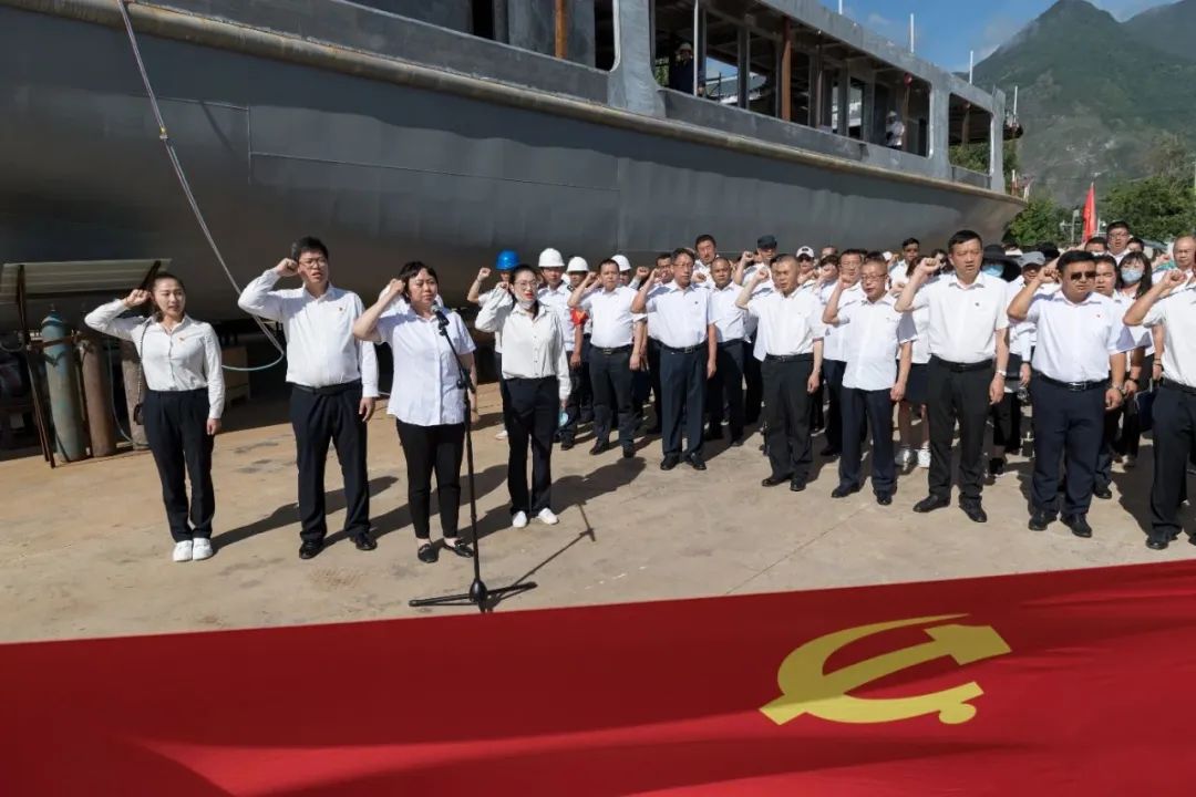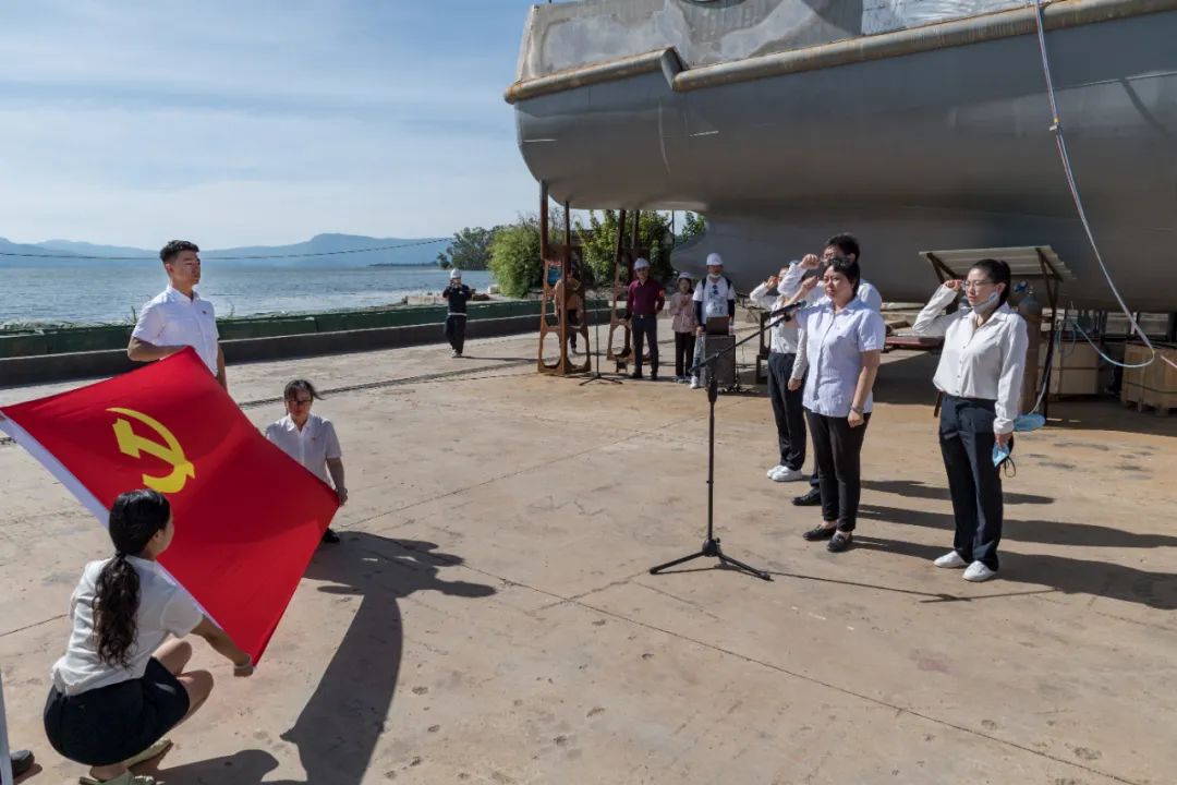 公司党委创新活动形式,将宣誓地点定在桃源码头268客位新能源船舶更新建造项目上。今年新入党的预备党员在洱海畔面向党旗庄严宣誓,公司党委委员、副总经理陶婷同志领誓,在场的全体党员共同重温了入党誓词。宣誓结束后,参加活动的全体人员共同参与了268客位新能源船舶更新建造项目的调研。