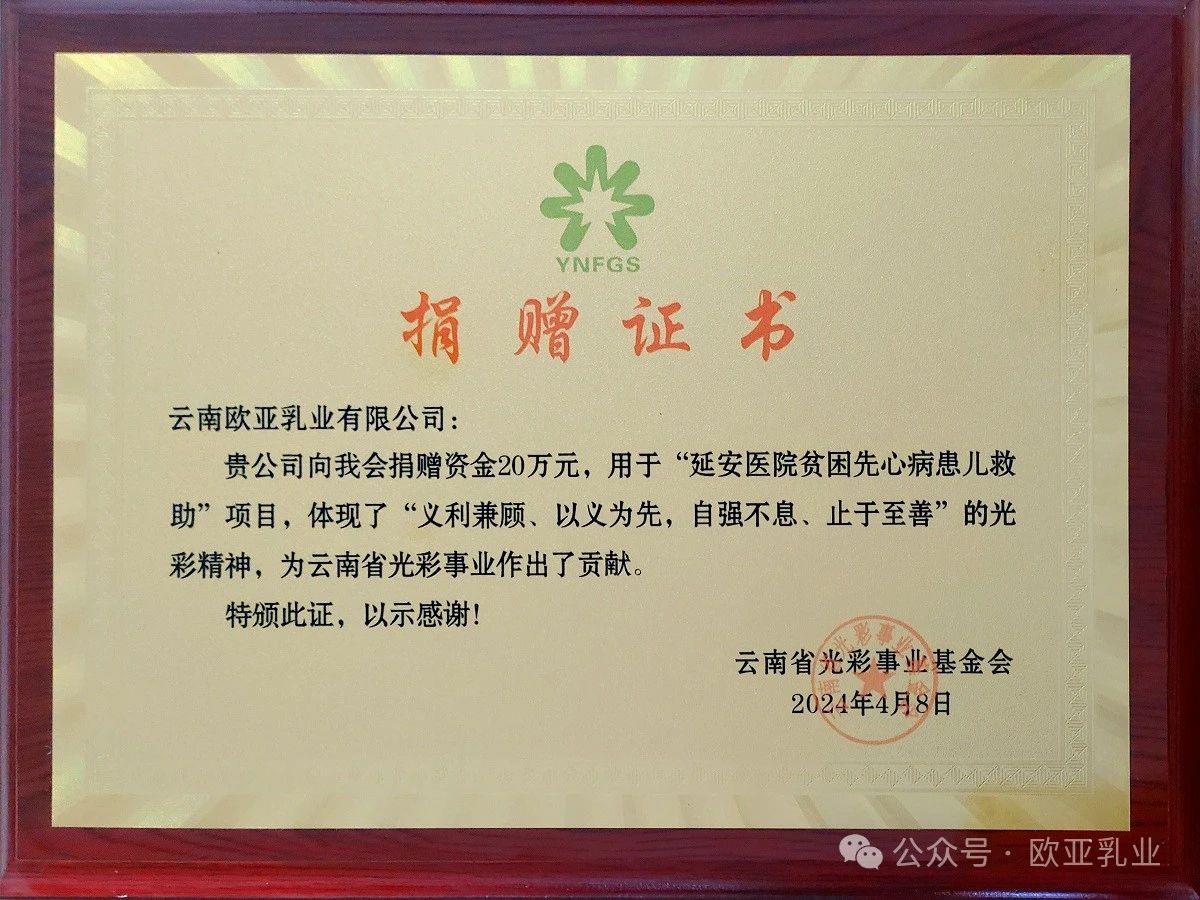 捐资助学、救灾扶贫,欧亚乳业用实际行动弘扬扶危济困精神,传递向善向上力量,今后,公司将不忘初心,牢记使命,在各级党委、政府的领导下,持续投身社会公益事业,为社会和谐发展贡献力量,同时,也衷心祝愿所有患病儿童能够早日战胜病魔,共享美好生活。