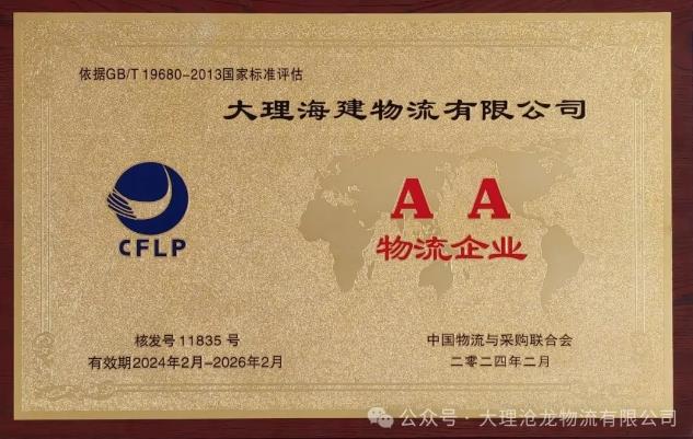 大会举行了隆重的颁证授牌仪式,向获得37批A级物流企业以及同期的担保存货管理与质押监管企业、星级冷链物流企业、网络货运平台企业、供应链服务企业以及“中国物流与供应链金融智库专家”、“中物联金融委特约研究员”进行授牌。全国第37批A级物流企业共414家,本次云南省新增A级物流企业6家,其中大理州有2家,大理州企业家协会常务副会长单位——大理沧龙物流有限公司下属的全资子公司大理海建物流有限公司被认定为国家AA级物流企业,这是大理海建物流6年发展的历史见证和获得的最高荣誉。
