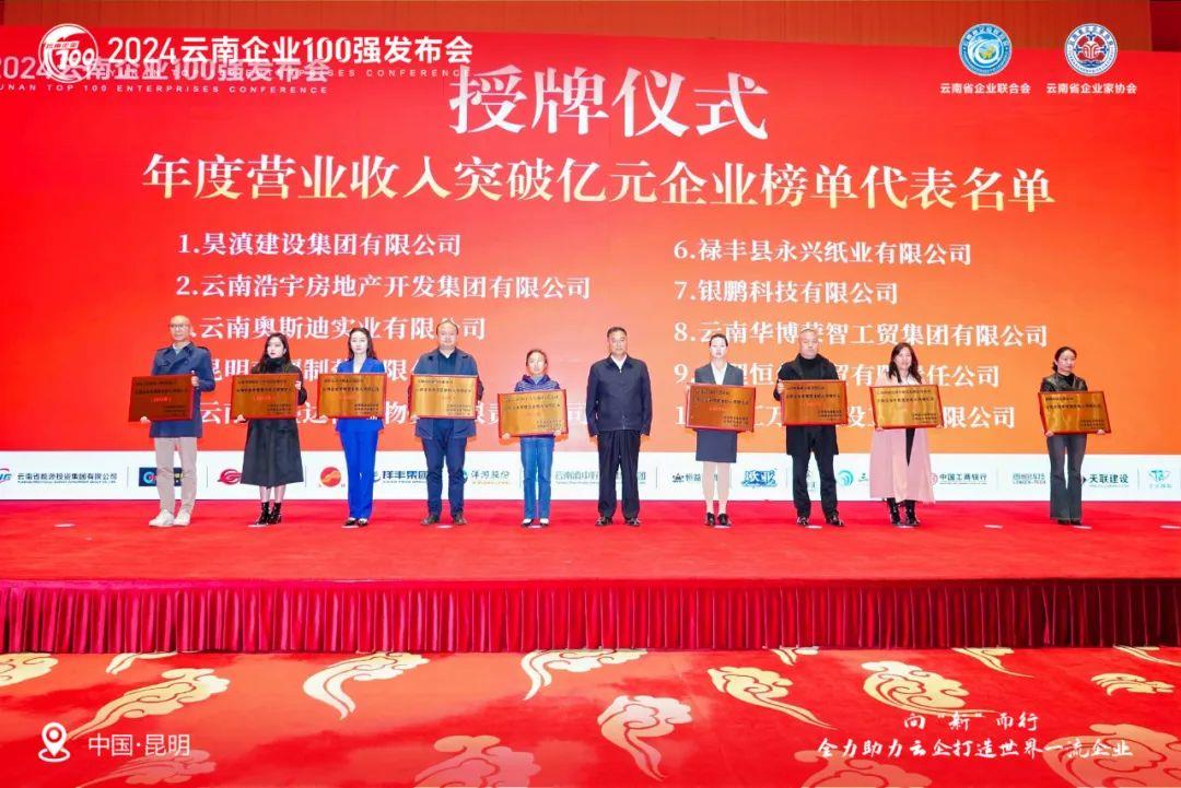 11月22日,由云南省企业联合会与云南省企业家协会联合主办,以“向‘新’而行 全力助力云企打造世界一流企业”为主题的“2024云南企业100强发布会”在昆明举行,会上发布了2024云南企业100强榜单、云南制造业企业100强、服务业企业50强、高新技术企业100强和云南企业年度营业收入突破亿元企业名单。