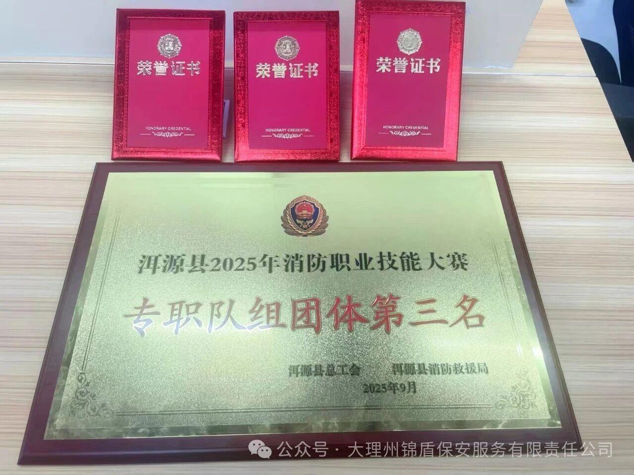 国庆前夕在洱源县举办的“2025年消防职业技能大赛”中,大理州企业家协会副会长单位——大理州锦盾保安服务有限责任公司派驻至客户单位的8名消防员组成的参赛队,凭借过硬的业务技能和出色的临场发挥,从全县15支精锐队伍中脱颖而出,荣获“专职队组团体比赛”第三名的优异成绩。在竞争更为激烈的个人赛中,锦盾保安公司队员林可银和赵琴超两位同志在“手抬机动泵出水操”项目中双双斩获第二名;林可银更是一鼓作气,在“一人三盘水带连接操”项目中再夺第三名。他们用沉甸甸的奖牌和证书,充分展现了锦盾消防员卓越的个人素养和专业技能。