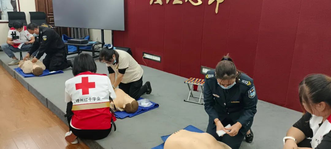培训主要分为救护理论知识讲解和自救互救能力现场实操培训两大部分。州红十字会专家老师以简单易懂的语言分别从现场心肺复苏,创伤急救基本技术、止血、包扎、骨折固定,伤员搬运,中暑、触电、溺水、烧烫伤、气道异物梗阻等意外事故急救知识和技能等方面展开授课并在现场通过模拟人手把手模拟演练。