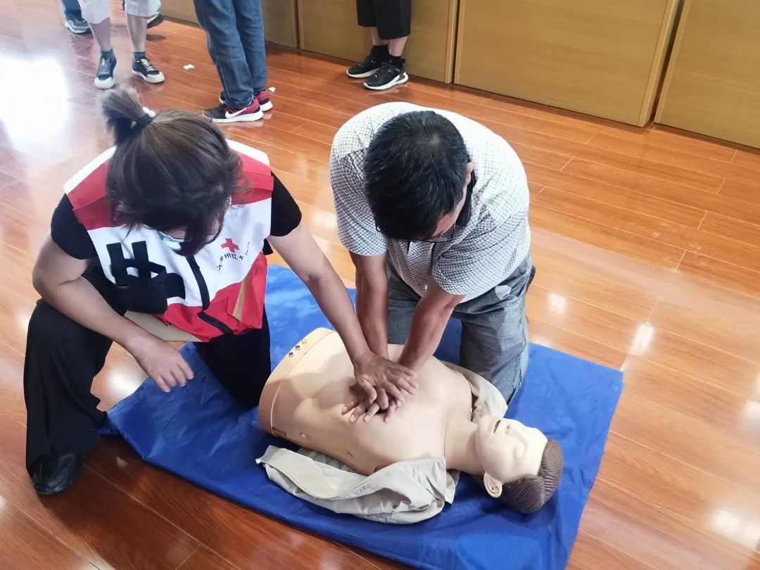 培训现场,老师演示了如何在抢救的黄金时间给生命垂危的人做心肺复苏、解除气道异物阻塞的急救方法,并对人体不同部位止血包扎的正确处理方法进行了示范操作、情景互动和不规范动作纠正。通过现场互动演示,让大家更直观地学习到了规范的急救流程和正确的处置方法。