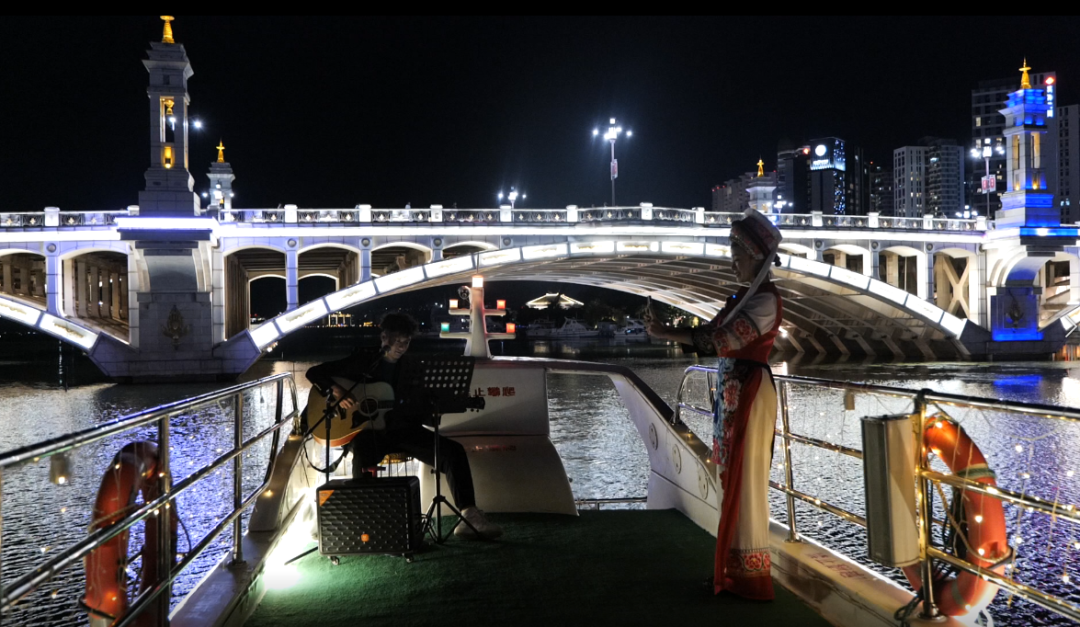 在夜游的游船上,我们可以看到身着白族服装的大理旅游集团公司工作人员纷纷用手机拍摄发布着各类短视频。