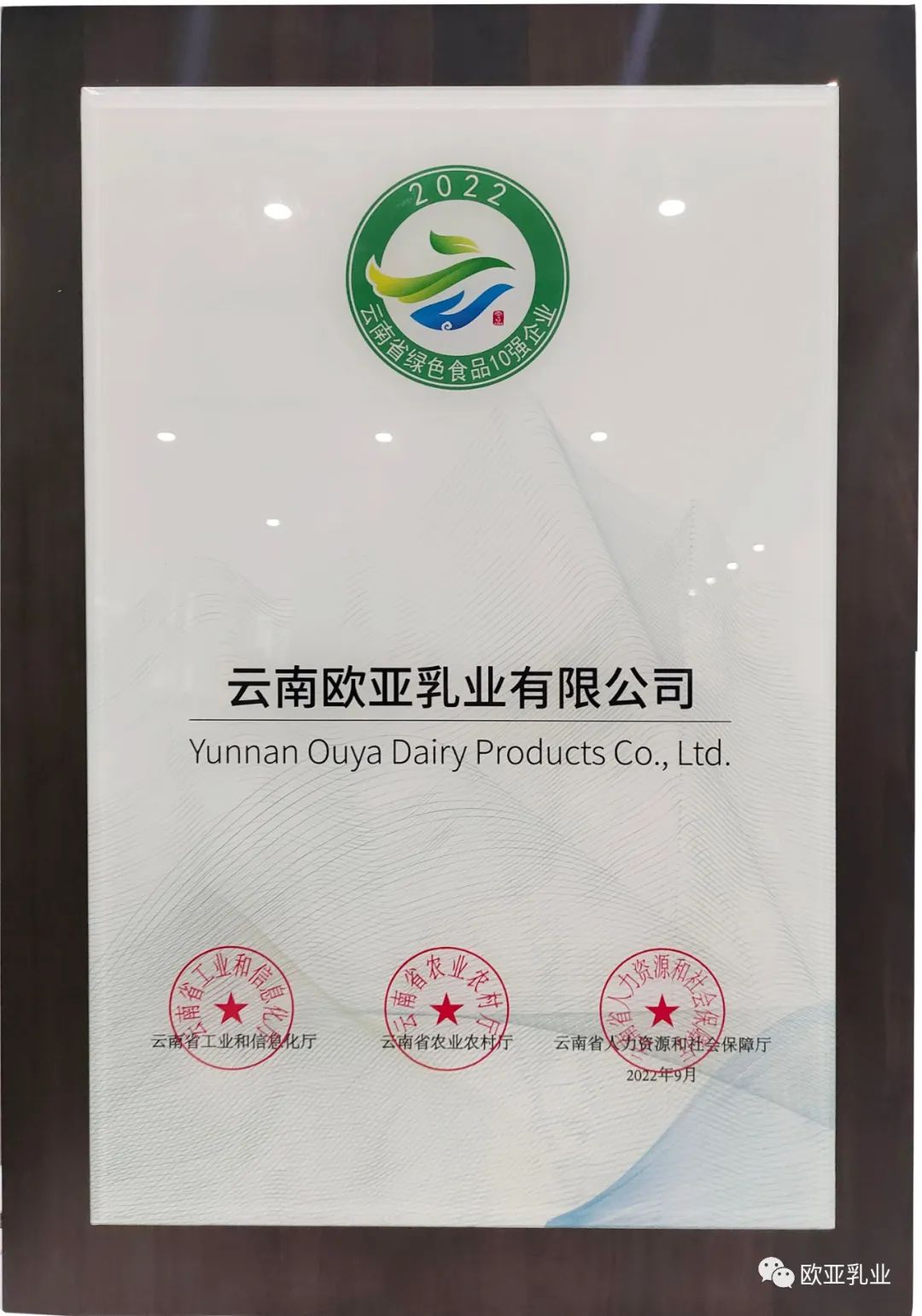 9月23日,昆明海埂会堂呈现出一派丰收喜庆的景气,大理州企业家协会理事单位——云南欧亚乳业在此被省委、省政府授予云南省绿色食品“10强企业”称号,这也是评选活动开展5年以来,公司连续第5次获得该项殊荣。