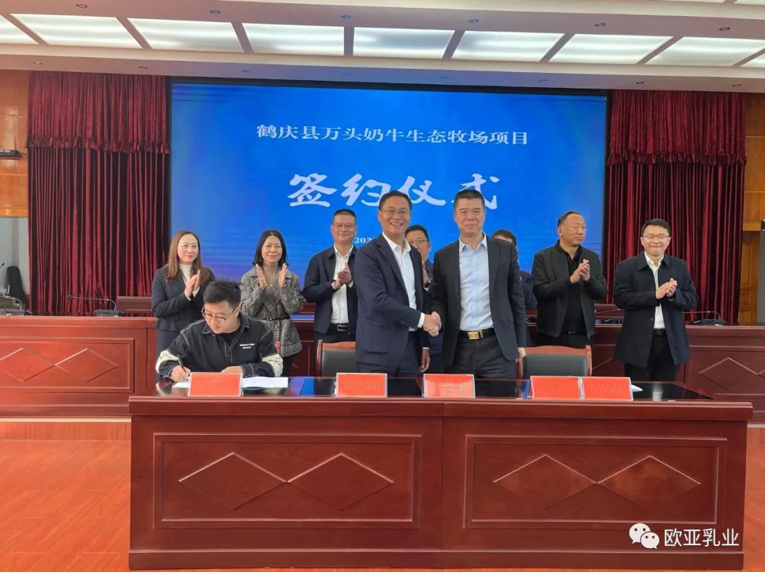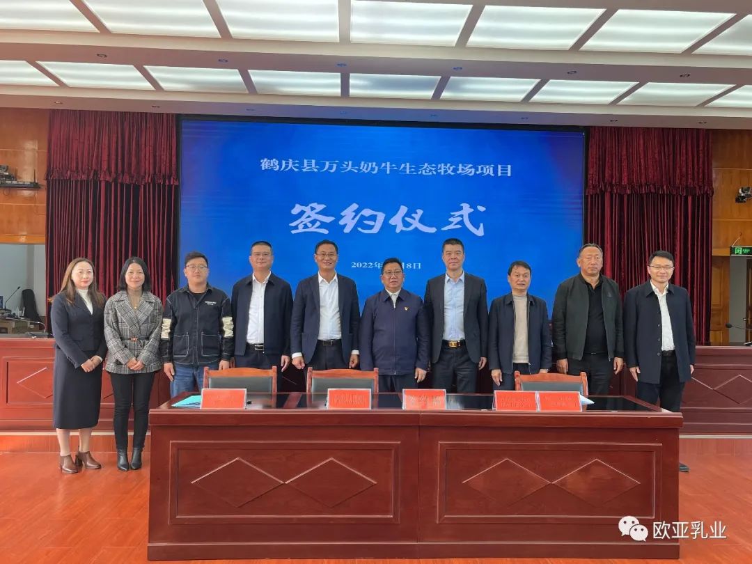 为加快绿色奶源基地建设,提高优质原料奶供应量,大理州企业家协会理事单位——云南欧亚乳业有限公司继2015年在鹤庆县金墩乡北溪村投资建设万头国家级奶牛标准化示范场后,11月8日,又与鹤庆县政府签定投资协议,新建一个存栏11000头娟姗奶牛的有机生态牧场。大理州政府党组成员、一级巡视员吉向阳,鹤庆县四班子领导,县级相关部门负责人等领导出席仪式,欧亚乳业公司董事长彭金国及管理人员参加仪式。