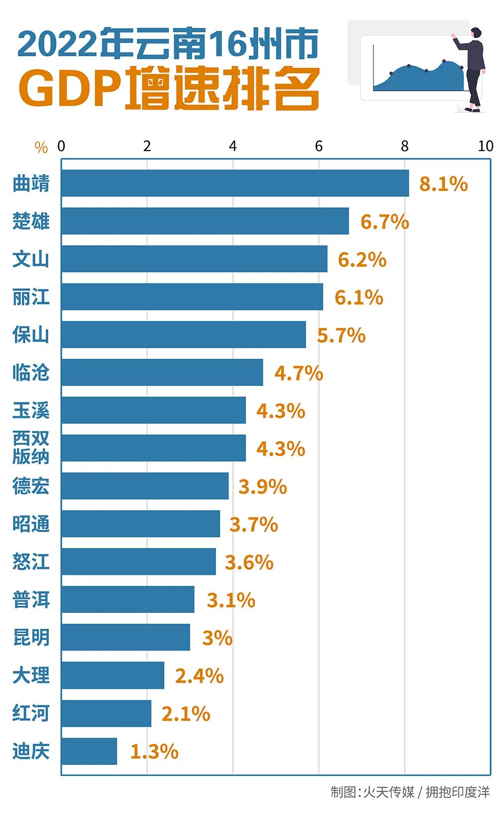 2022年,大理州实现地区生产总值1699.62亿元,省内排位第六,相比2021年落后一位。GDP增速2.4%,低于全省1.9个百分点,整体成绩不是很理想。